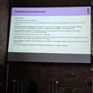 Im Herbst startete das beantragte Projekt Kinderschutzparcours 2.0, das von Sören Jagnow mitentwickelt und begleitet wurde, mit der Zielsetzung, wichtige Facetten des Themas Kinderschutz und Prävention für interessierte junge Menschen und weitere freiwillig/ehrenamtlich Tätige begreifbar und damit nachvollziehbar zu machen. Er richtet sich insbesondere an junge Menschen ab 14 Jahren aus unterschiedlichen Jugendarbeitsbereichen, interessierte Multiplikator*innen oder Jugendleiter*innen. Auf der Basis im Parcours vermittelten Erfahrungen und Erlebnisse wird ein Einstieg in verschiedene Bereiche des Themas Kinderschutz angeboten.