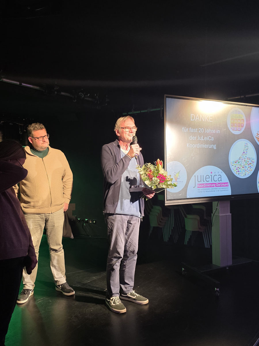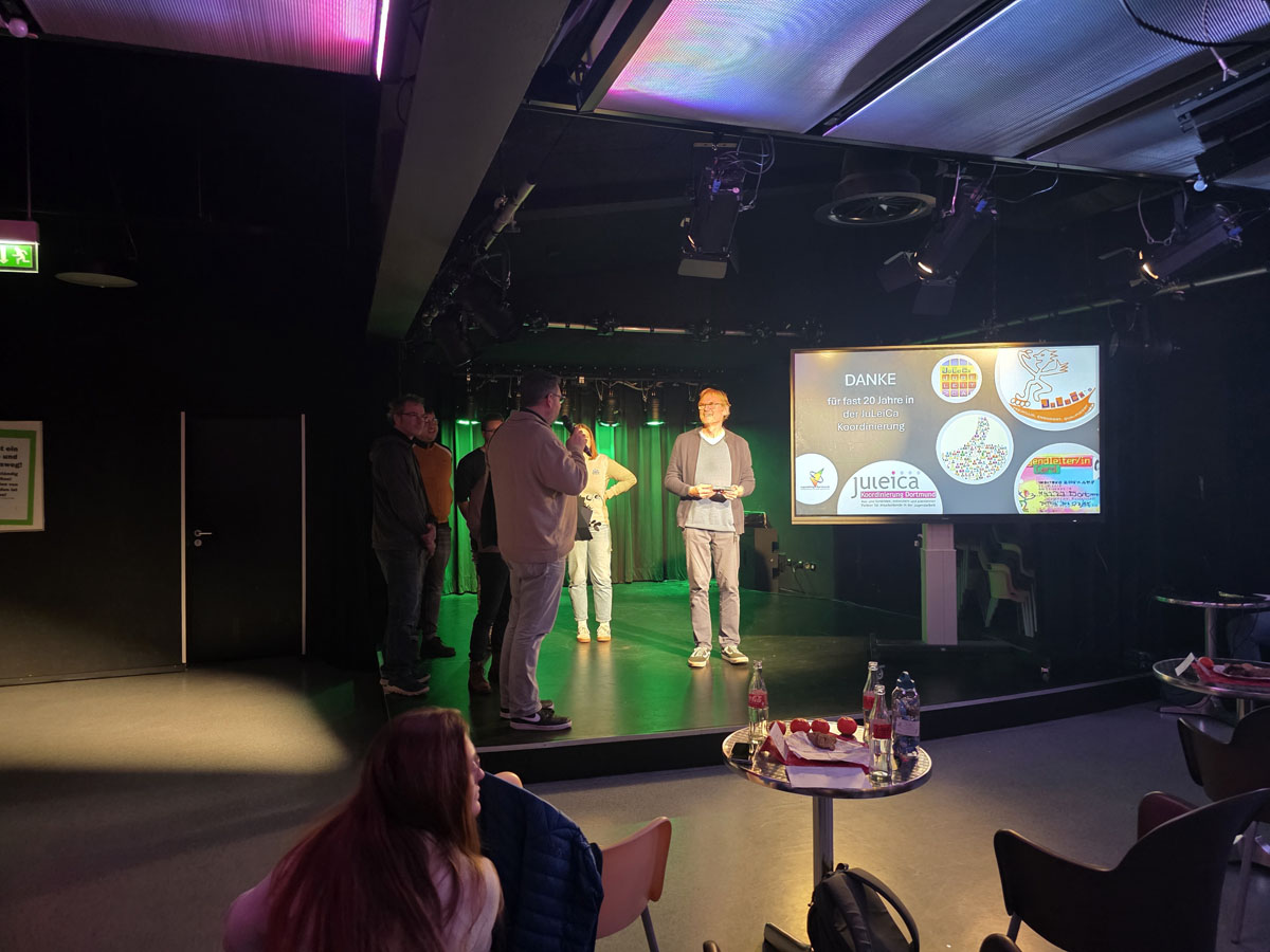 Zum Ende des „offiziellen“ Teils der Veranstaltung präsentierten die Mitarbeitenden des Jugendring Eindrücke aus fast 20 Jahren JuLeiCa Arbeit und verabschiedeten damit Rainer Hüls als langjährigen Mitarbeiter. Danke, lieber Rainer, für gemeinsames Aufbauen, Entwickeln und Anerkennen von freiwilligem Engagement!