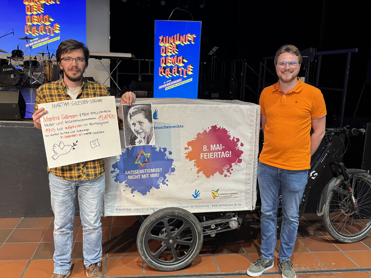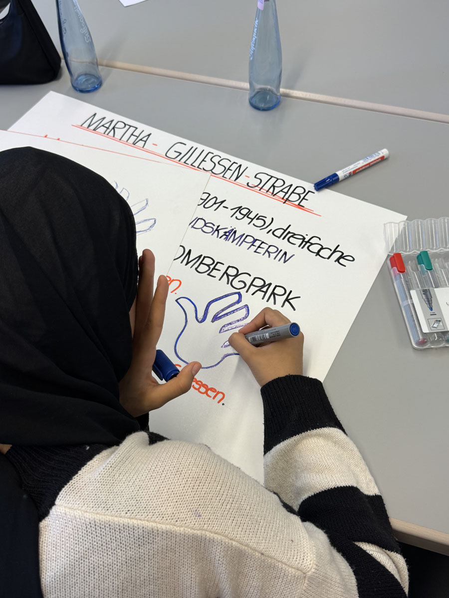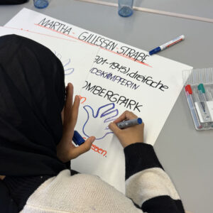 Die Bezirksvertretung Dortmund Nord hat anlässlich, des 80. Jahrestages der Befreiung vom Nationalsozialismus einen Demokratietag veranstaltet. Ziel der Veranstaltung war es eine Auseinandersetzung mit unserer Demokratie und ihren Veränderungen im Laufe der Jahre zu ermöglichen. In verschiedenen Workshops am Vormittag konnten junge Menschen sich auf unterschiedlichste Weise mit Demokratie beschäftigen. Die Arbeitsstelle Zukunft braucht Erinnerung konnte einen Workshop zu Martha Gillessen anbieten. Die Jugendlichen beschäftigten sich mit ihrer Biografie und entwarfen eine Infotafel, welche ihren Platz in der Martha-Gillessen-Straße finden soll, um dort an Martha-Gillessen zu erinnern. Martha Gillessen wurde von den Nationalsozialisten im Rahmen der Kriegsendverbrechen in der Bittermark ermordet.