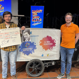 Durch die interaktive Fotoaktion der Arbeitsstelle Zukunft braucht Erinnerung wurden Besucher*innen dazu eingeladen Haltung zu zeigen, z.B. „Für eine Welt ohne Diskriminierung“, „Erinnern-Denken-Handeln“ oder „Antisemitismus? Nicht mit mir!“.