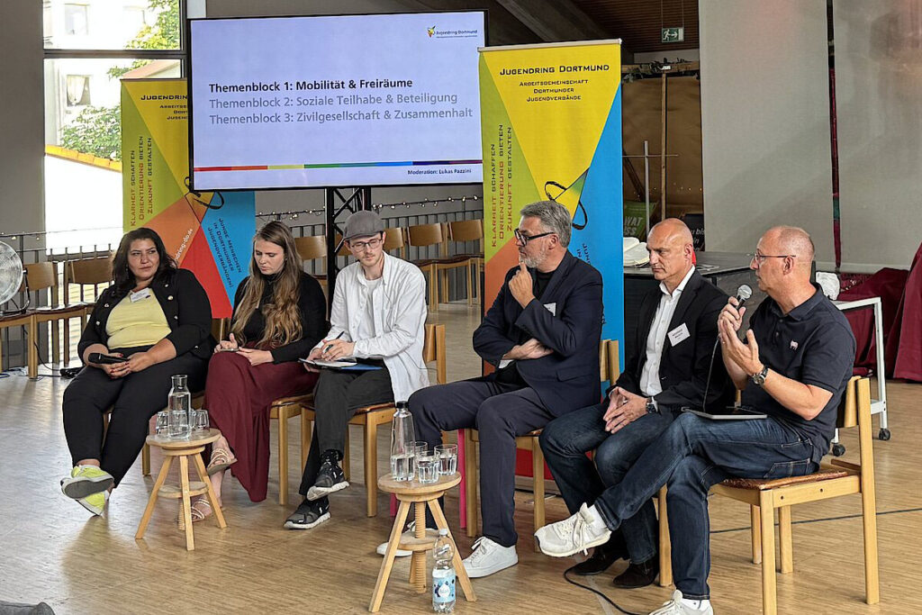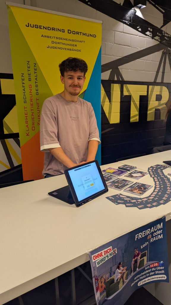 Im Juni 2025 fand im Rahmen der Vollversammlung des Jugendring Dortmund eine Podiumsdiskussion mit den OB-Kandidat*innen im Studio41 statt. Unter souveräner Moderation des 19-jährigen Journalistikstudenten Lukas Pazzini diskutierten hier die Delegierten der Dortmunder Jugendverbände über zentrale Anliegen junger Menschen an Dortmunder Kommunalpolitik: bezahlbarer Wohnraum, sichere und barrierefreie Mobilität, nicht-kommerzielle Räume für Jugendliche und die Förderung von Vielfalt, Teilhabe und demokratischer Bildung.