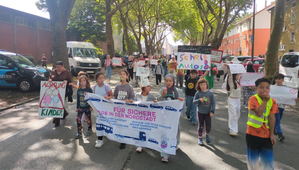 Im Rahmen des Projekts Verkehrsgerechtigkeit organisierte die OG Nord eine Demonstration für sichere Schulwege in der Dortmunder Nordstadt mit klaren Forderungen nach Tempo 30, sicheren Rad- und Fußwegen und weniger Schwerlastverkehr.